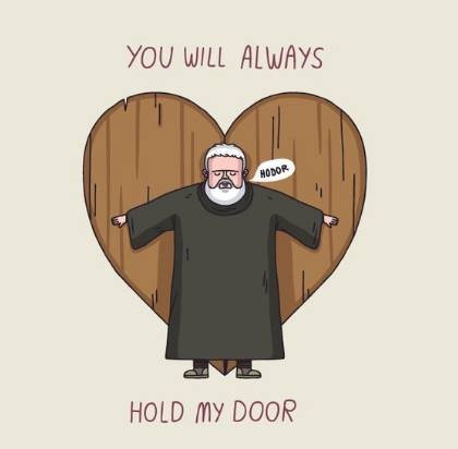 Many of the Hodor-memes are easily posited into this continuum of commemoration. One can regard them as online memorials[lxxvi] or as disparaged spontaneous memorials[lxxvii] but in both cases they circulate elements familiar from the aforementioned traditions of commemoration. The early tributory memes, for instance, are fraught with a positivity that links them to the traditional formulas of commemoration. They celebrate the heroism of Hodor by focusing on his lived life in sweet drawings (Fig. 10) and in the circulation of familiar imageries in a new context of glory. Often these memes are also accompanied by comments and quotes displaying appropriate sentiment. This is true of the a Hodor-meme (Fig. 11) that is circulated with a caption saying: “Hodor always had his back, no matter what. My heart is so sad now”. These kind of tributary images abide to the socially acceptable manner for displaying grief and mourning. Likewise, the crowdfunded, wood-engraved doorstops mimic the solemnity of a marble tomb (Fig. 12). How can they, thus, evoke controversy by appearing “too soon”? And how do the less solemn Hodor-themed doorstops fit into the prevailing traditions of mourning?